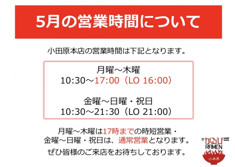 かるびラーメン小田原本店につきまして、本日は終日臨時休業となります。